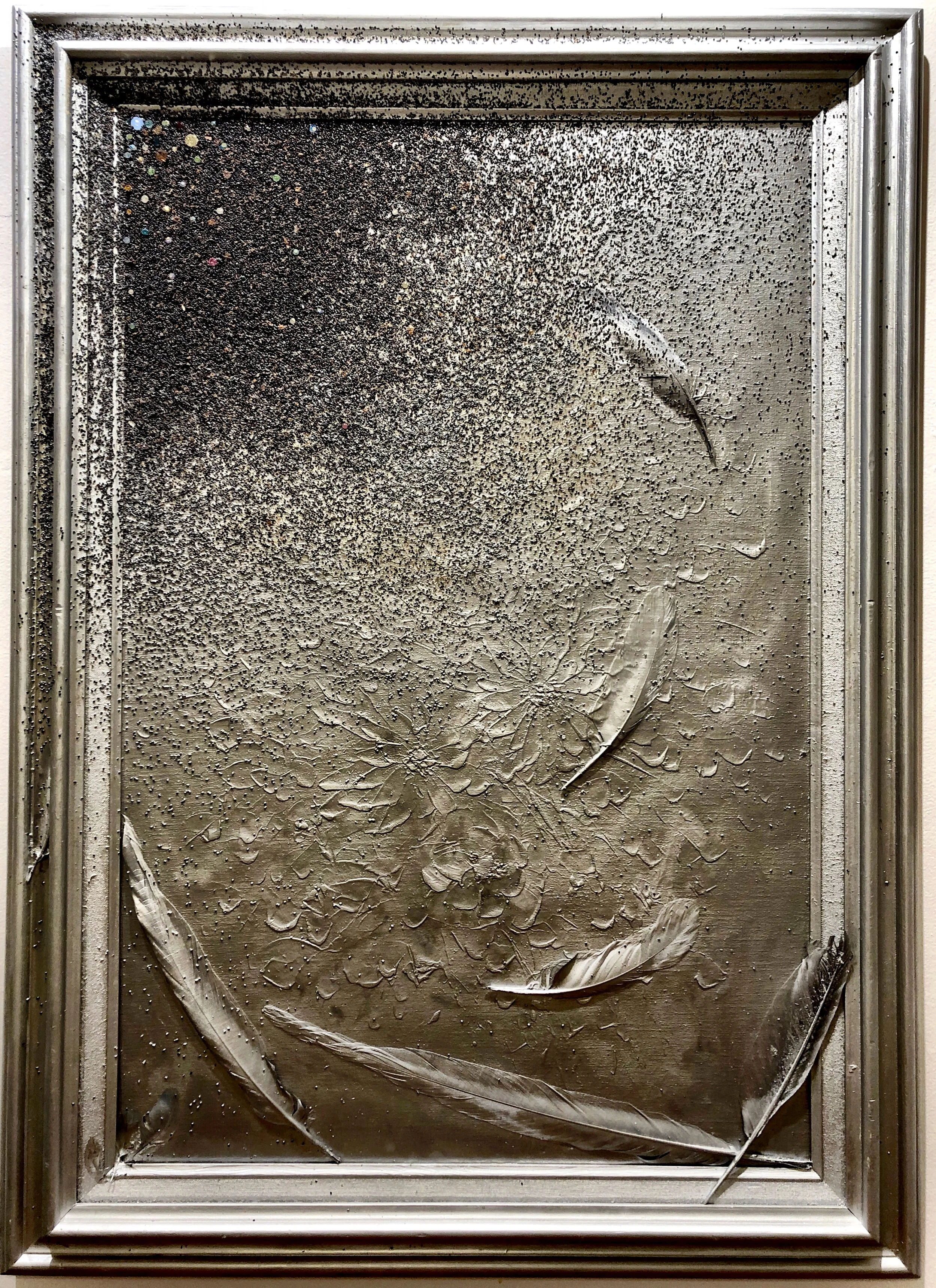 Quantum Identity VIII: Brave Multiplicity - This Bright Mystery. Discarded auto paint, saguaro seeds, molted macaw feathers, vintage Swarovski crystals on a discarded canvas and frame.
