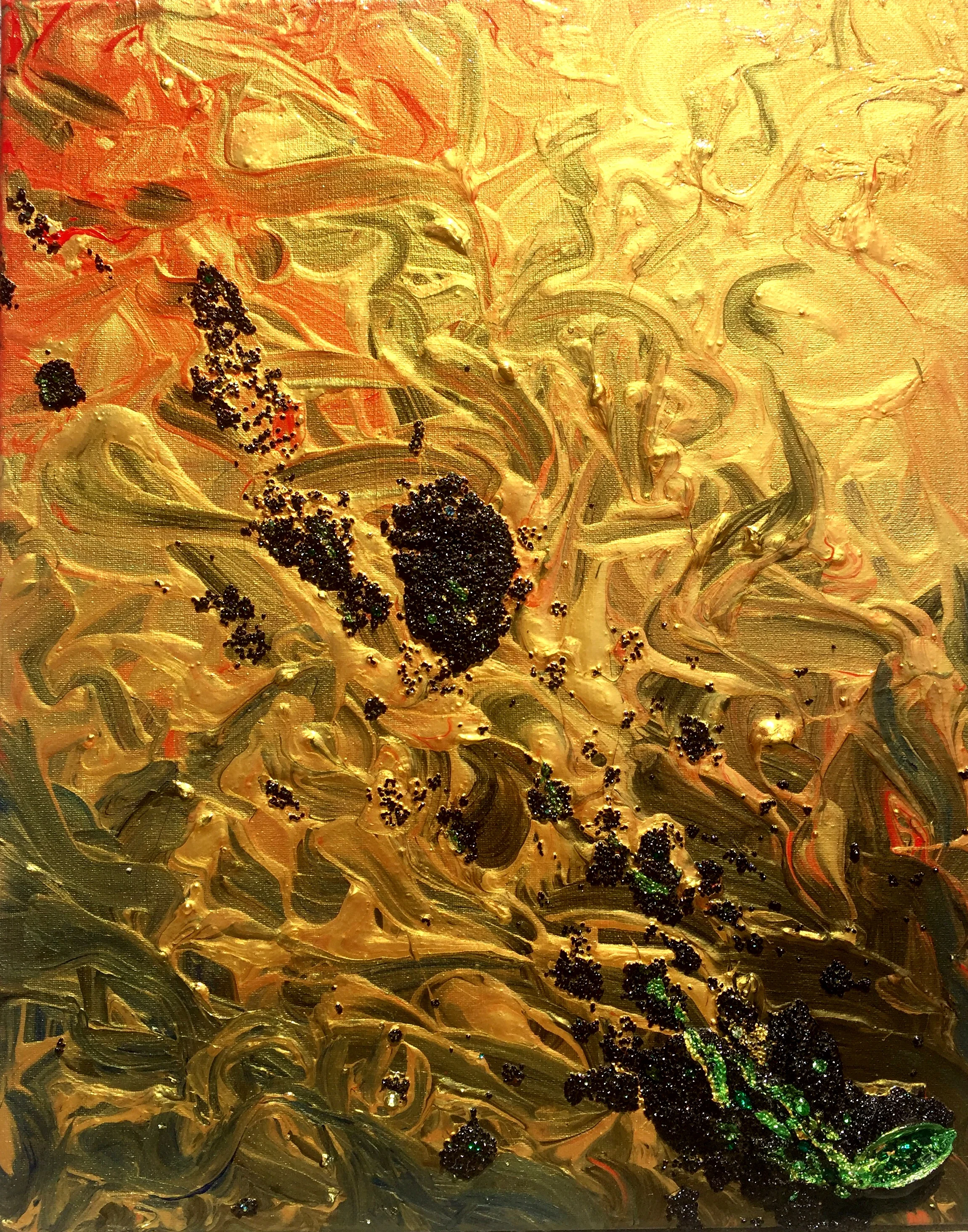 Click on the photo to enlarge. Acrylics, saguaro seeds, a bottle brush seedpod, and vintage Swarovski crystals on a discarded canvas.