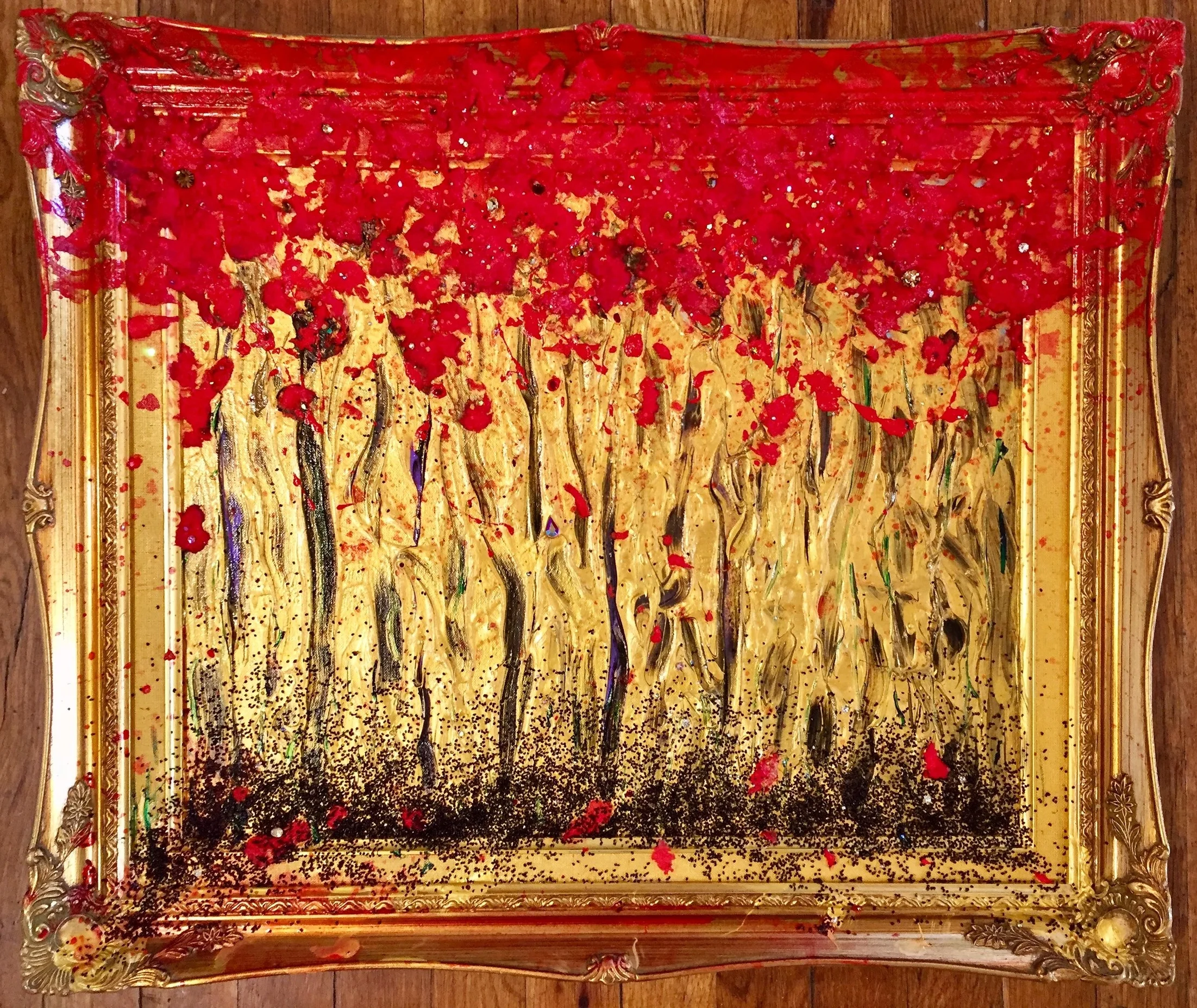 The saguaro seeds represent this in a literal sense, but the red leaves, made of paper soaked in a mixture of calligraphy inks, paints, varnish, glitter, mica, and a small amount of my blood and saliva, hold multiple meanings. Obviously, they speak to the titular leaves, but they are thrown on to the canvas violently, leaving stains and spatters everywhere. I threw the tiny clumps of crimson all over the piece with wild abandon, just like the seeds and spores that feed and overwhelm every hungry thing in the forest. I also used hundreds of tiny seed crystals. The larger crystals were placed with precision as a counterpoint to the randomness of the piece, but the smaller seed crystals were just scattered with abandon, like seeds and spores are in the wild. Some glimmer with brilliant color, but many are buried in the paint or their matte backsides are toward the viewer. This speaks to the fact that nature has to be abundant enough that there will be more than enough sown to perpetuate itself even in the face of winter, drought, and all the things that could consume or harm the life held in each tiny kernel, grain, or spore.